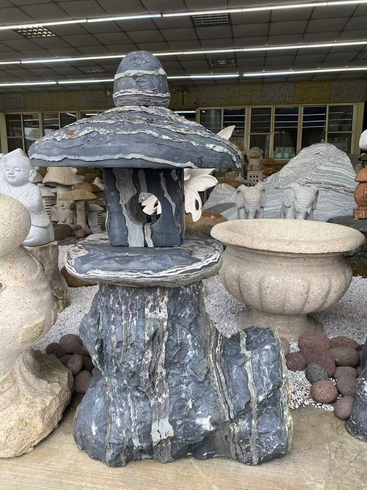 黑金花石燈以深色花紋石材呈現穩重內斂的視覺效果, 是日式庭園中常見的經典造景元素之一。 白天作為景觀焦點,夜間則透過燈光引導動線, 在庭園空間中形成安定而不張揚的存在感。