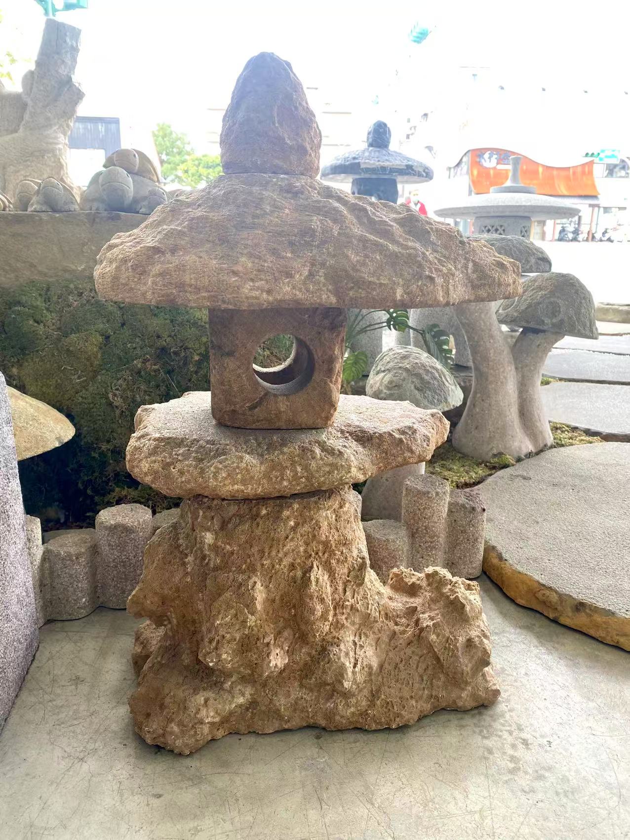 在庭園設計中,砂岩自然石燈常配置於步道轉折、水景周邊或入口視覺節點, 可與卵石、石米、溪扁石等景觀石材搭配, 讓整體造景層次更顯沉穩、耐看, 兼顧實用照明與景觀美感需求。