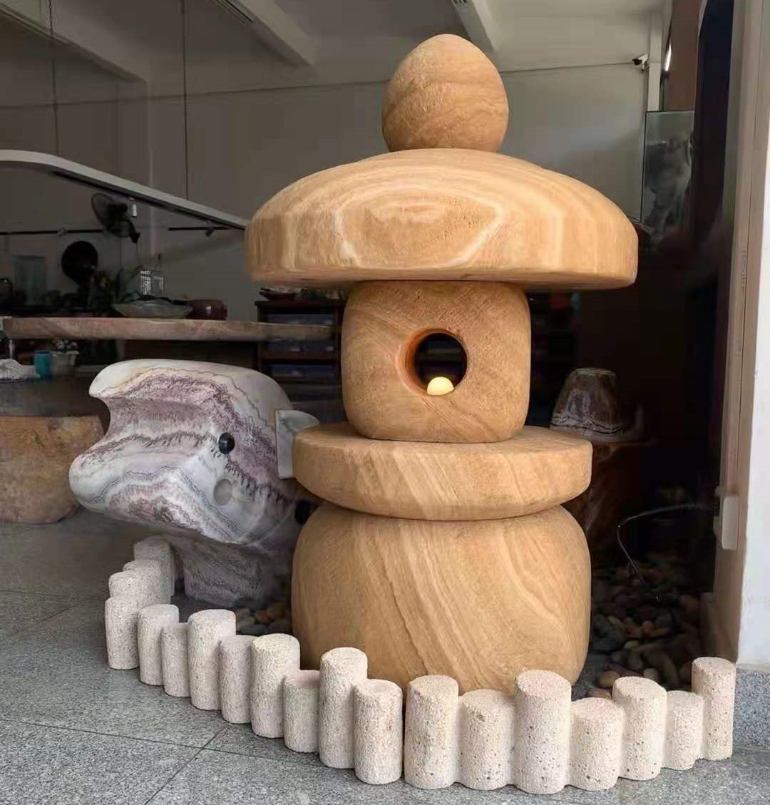 在庭園設計中,砂岩自然石燈常配置於步道轉折、水景周邊或入口視覺節點, 可與卵石、石米、溪扁石等景觀石材搭配, 讓整體造景層次更顯沉穩、耐看, 兼顧實用照明與景觀美感需求。