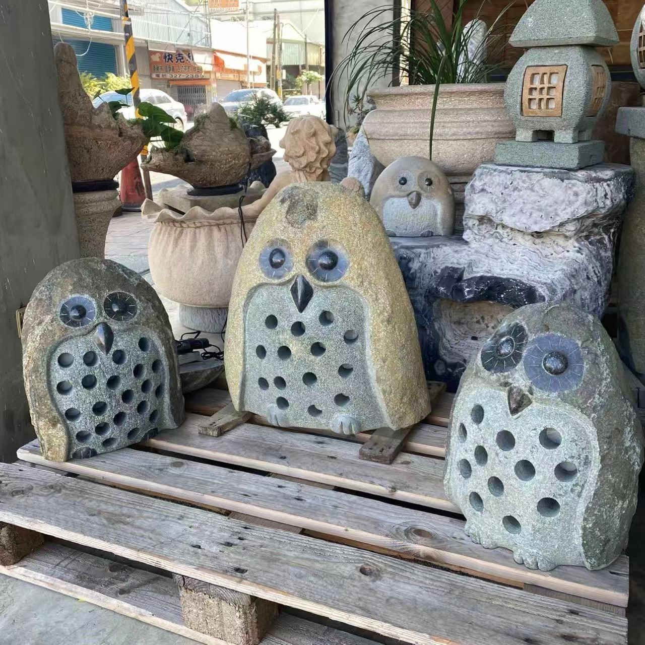 在庭園設計中,貓頭鷹自然石燈常配置於步道轉折、水景周邊或入口視覺節點, 可與卵石、石米、溪扁石等景觀石材搭配, 讓整體造景層次更顯沉穩、耐看, 兼顧實用照明與景觀美感需求。
