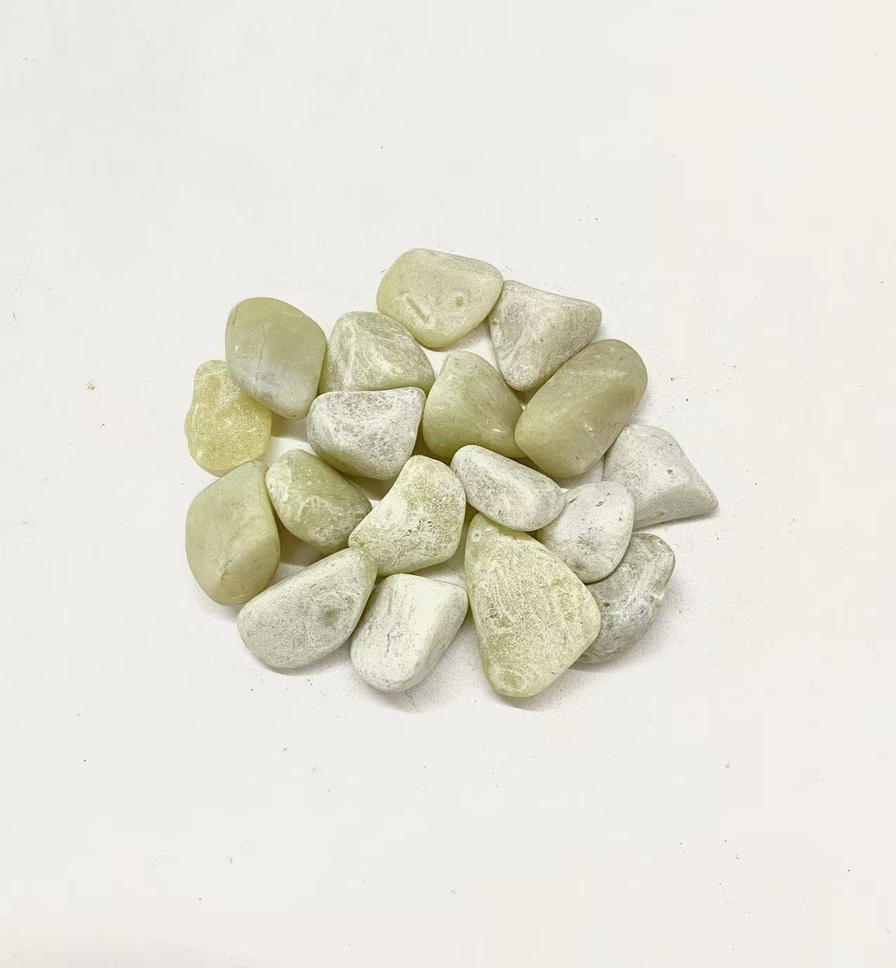 翠綠石呈現出柔和的淺綠色至黃綠色調,並夾雜著一些灰白色後乳白色的紋理或斑塊,經過滾磨處理,表面光滑圓潤,帶有自然的油脂或蠟狀光澤。具有寧靜、清新的感覺,非常適合營造自然、和諧的空間氛圍。