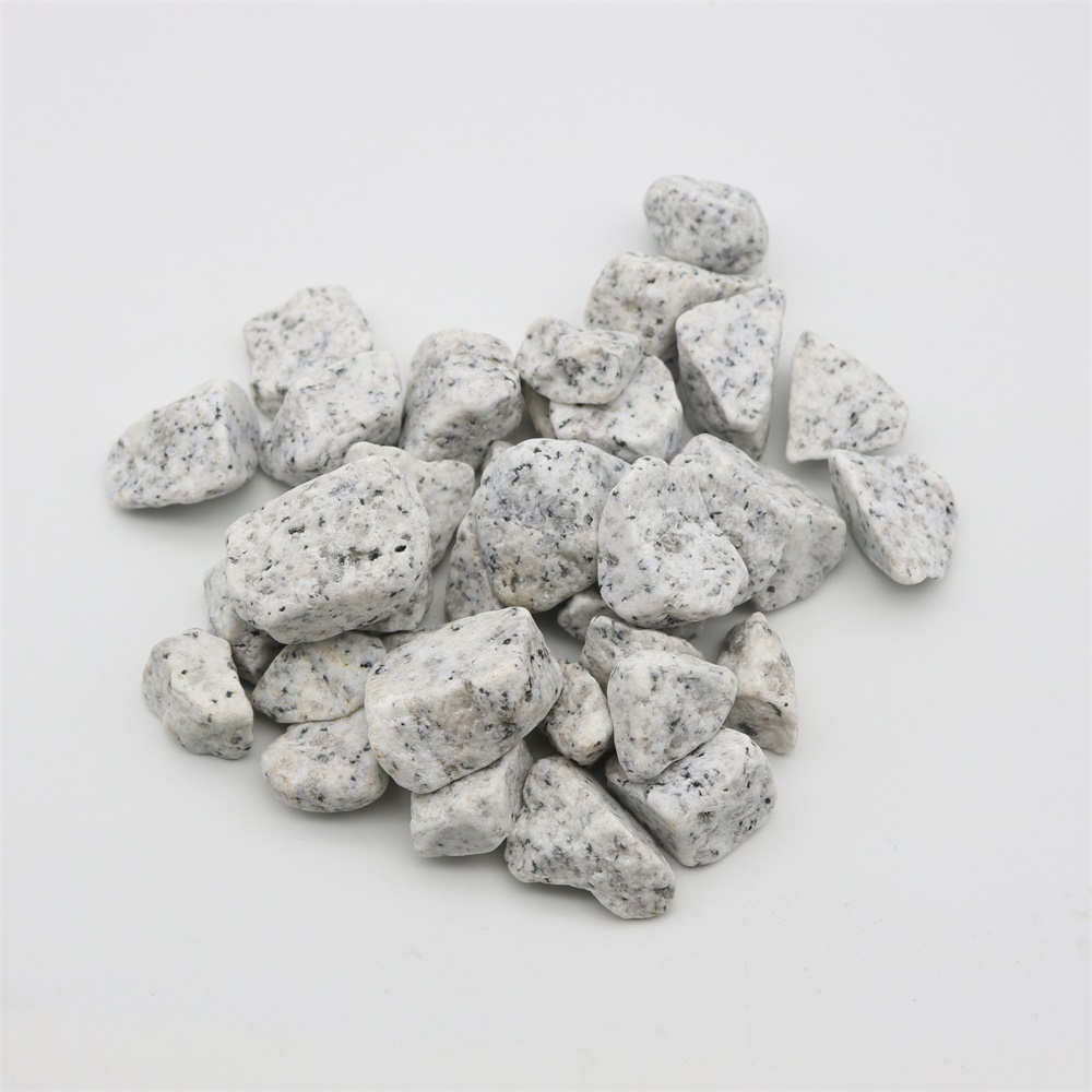 白芝麻碎石是由天然花崗岩粉碎而成,因其白底帶有細微黑點,視覺效果極像「白芝麻」而得名。其質地堅硬、吸水率低且耐酸鹼,表面呈現粗獷的自然斷裂面,具備極佳的止滑與抗壓性。相較於純白卵石的柔和,白芝麻碎石多了一份現代工業風與樸實感,是當代建築景觀設計中CP值極高的基礎裝飾石材。此外,小尺寸的白芝麻也是日式枯山水用來畫沙不錯的選擇。