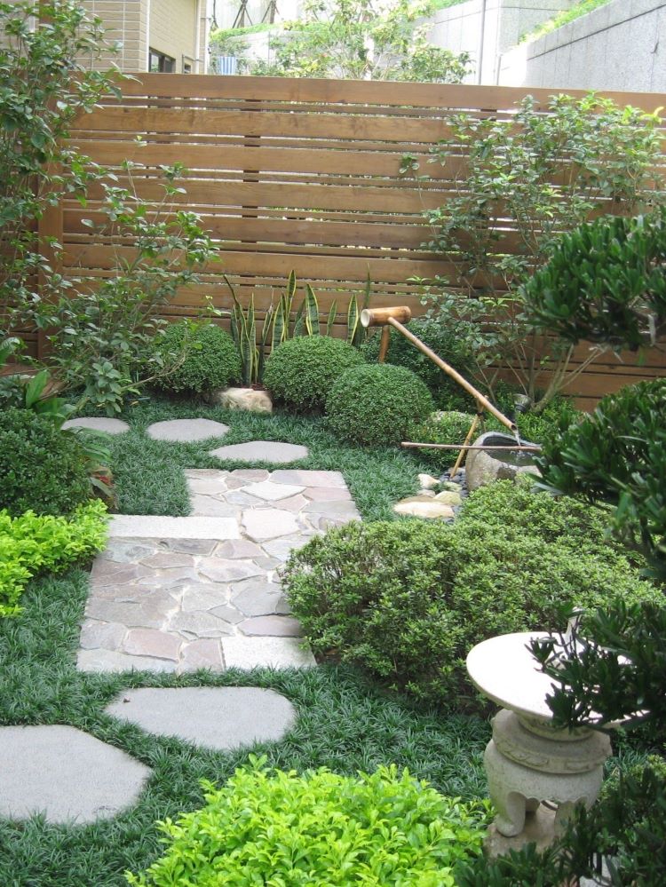 日式庭院以玄武石板與天然黑扁石鋪設步道, 串連整體綠意動線,讓行走其間的節奏隨著景觀自然展開。 庭院中央配置自然青石水缽,並搭配竹流水設計, 透過水聲與流動感,為空間注入內斂而安定的禪意氛圍。