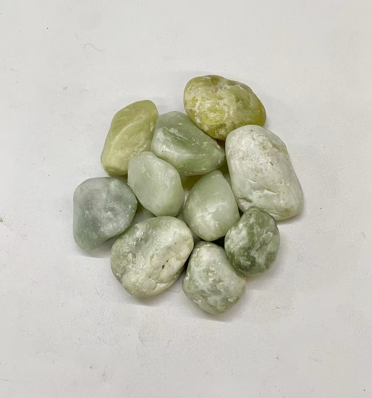 綠玉石呈現出柔和的淺綠色至黃綠色調,並夾雜著一些灰白色後乳白色的紋理或斑塊,經過滾磨處理,表面光亮圓潤,帶有自然的油脂或蠟狀光澤。具有寧靜、清新的感覺,非常適合營造自然、和諧的空間氛圍。