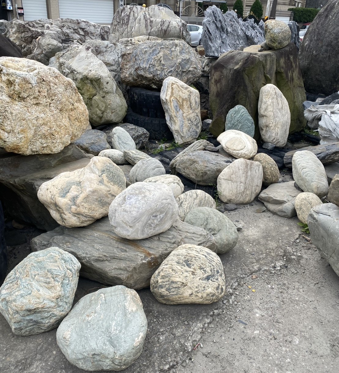 花纹石為常見於庭園與枯山水造景中的天然景觀石材, 有獨特的黑白或灰白色流動狀紋理,能夠與植栽、水景及木質元素自然融合, 呈現安定、寧靜的空間氛圍。
